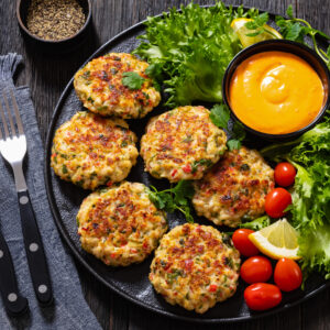 • Crab Cakes Whipped Red Pepper Feta & Baked Sweet Potato