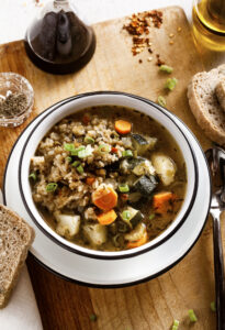 vegetable soup with rice and whole grain bread on the table. on a wooden cutting board