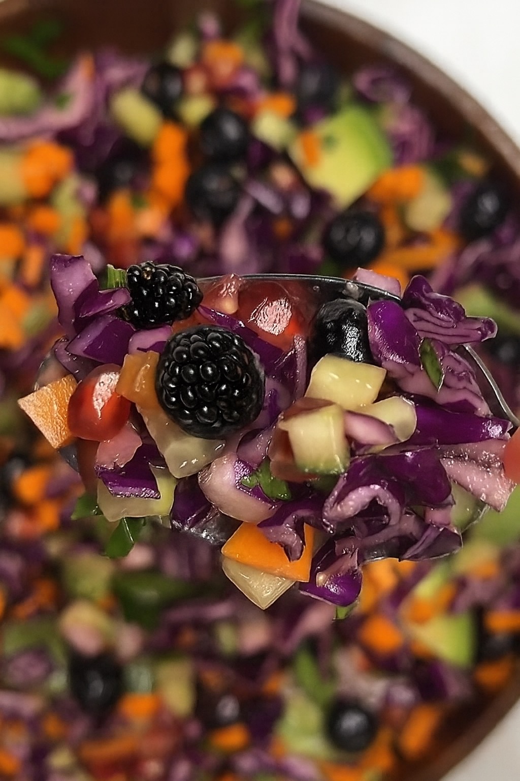 Winter Chop Salad – red cabbage, carrots, blackberries, pomegranate, cucumber
